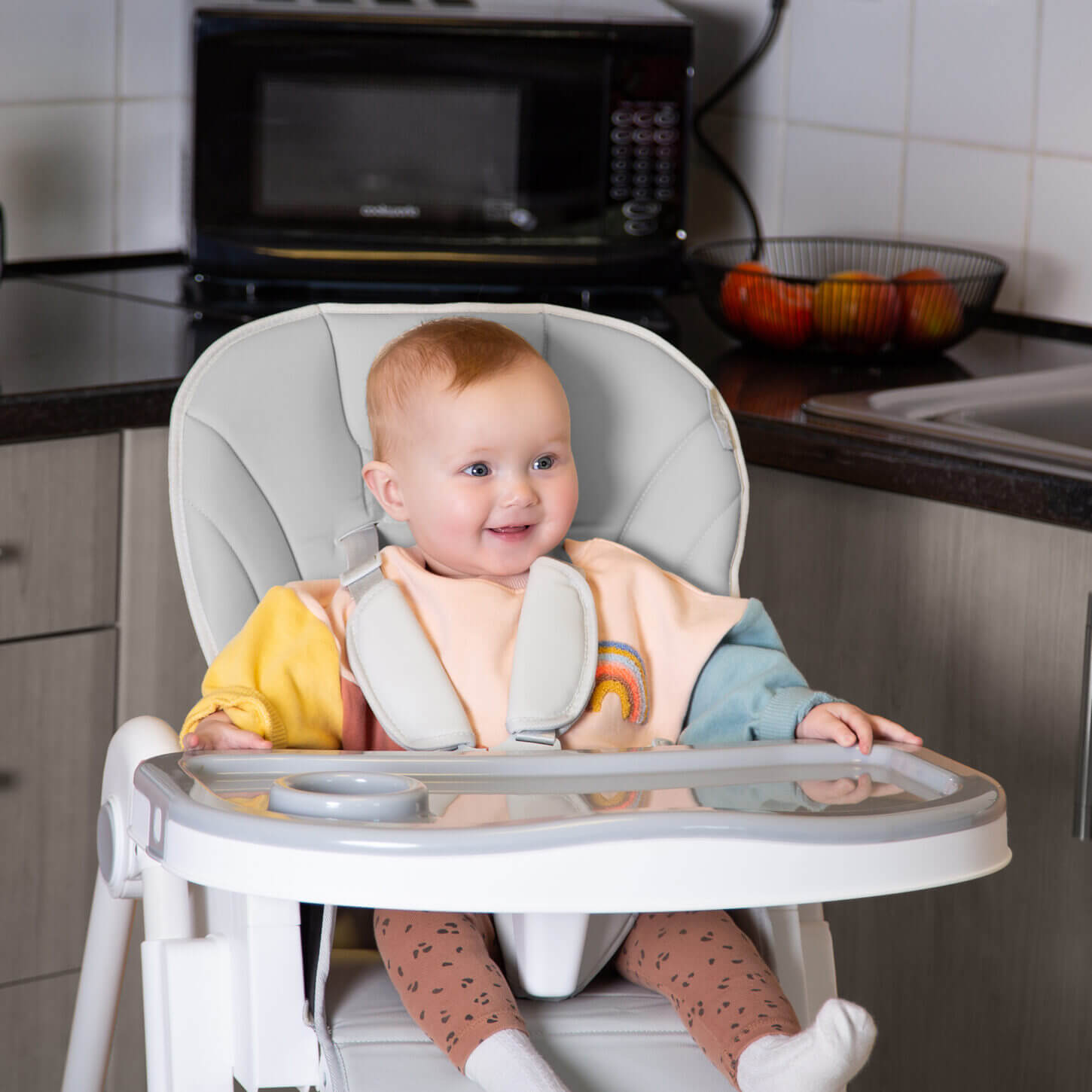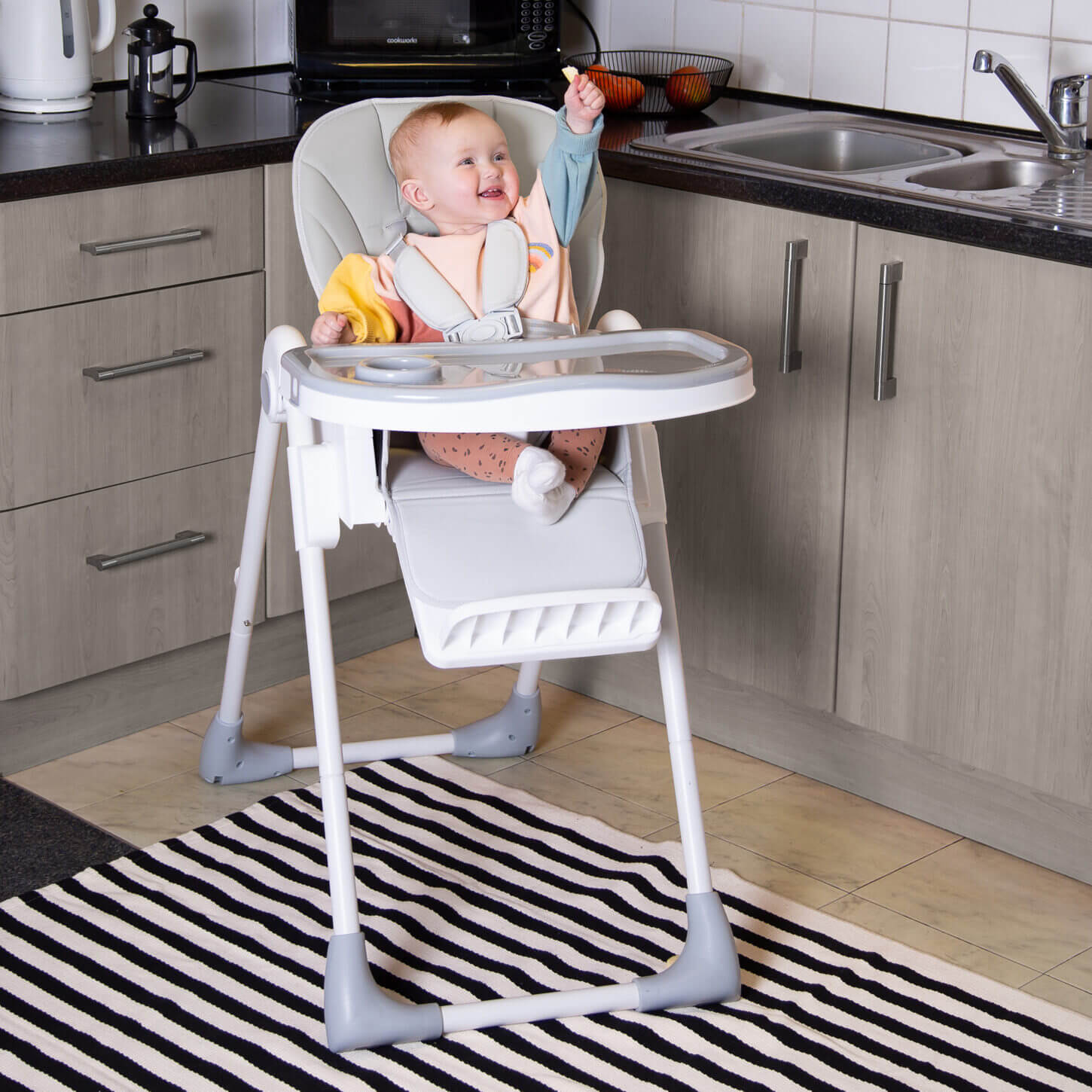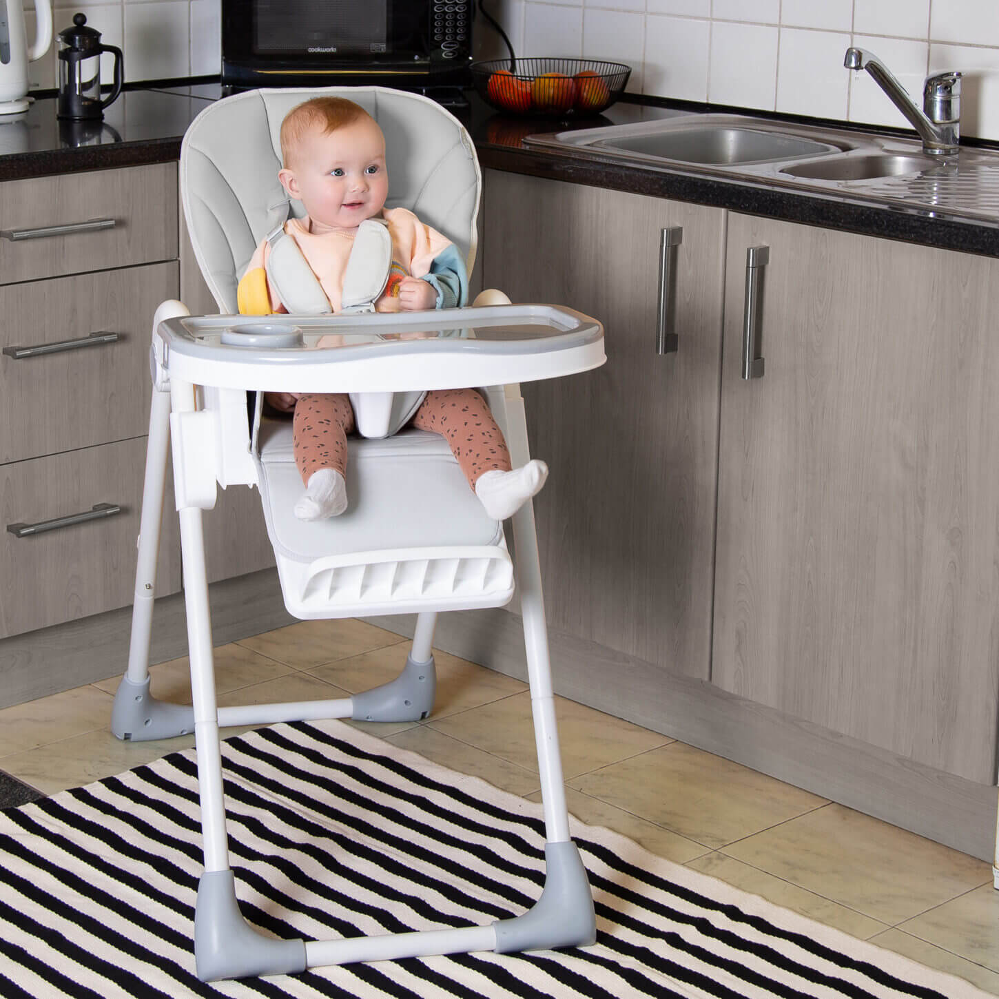 Classy matte finish with soft grey and white fabrics and frame allows the Feed Me Lolo to fit into any modern home.