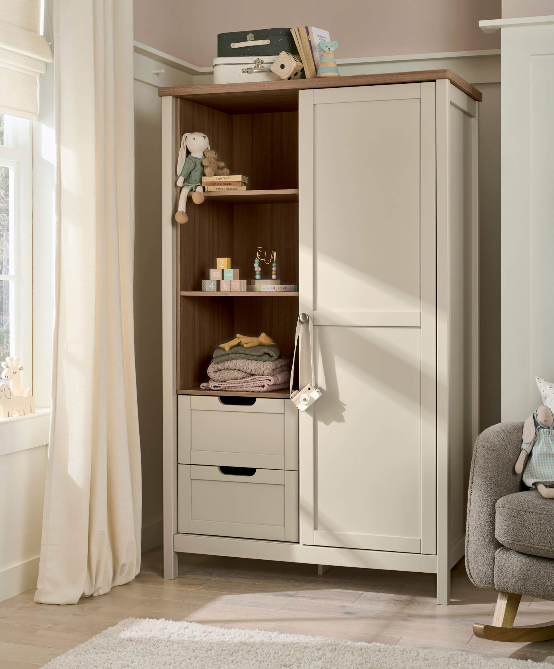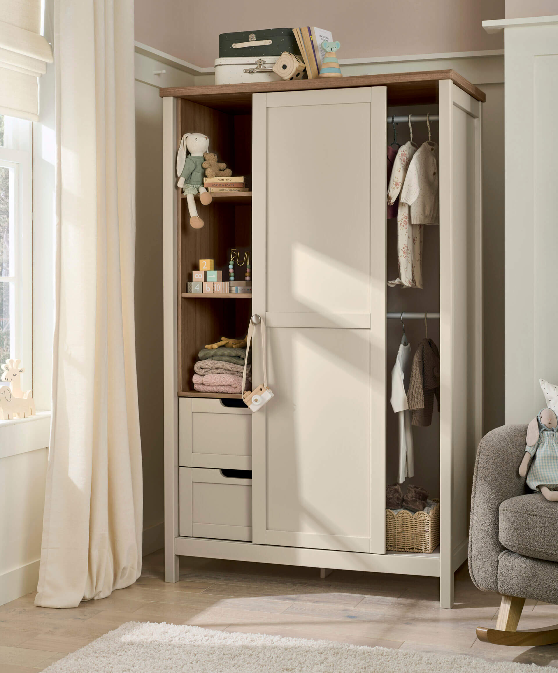 Keep your little one’s nursery neat and tidy with our Harwell wardrobe. It’s got a clean finish and two tone detailing, perfect for pairing with the rest of our range. With an easy sliding door, 2 removable rails for hanging clothes and 3 removable shelves, you can store everything from baby’s favourite books and toys to clean outfits and bedding. The wardrobe drawers are also soft close so you won’t disturb baby.