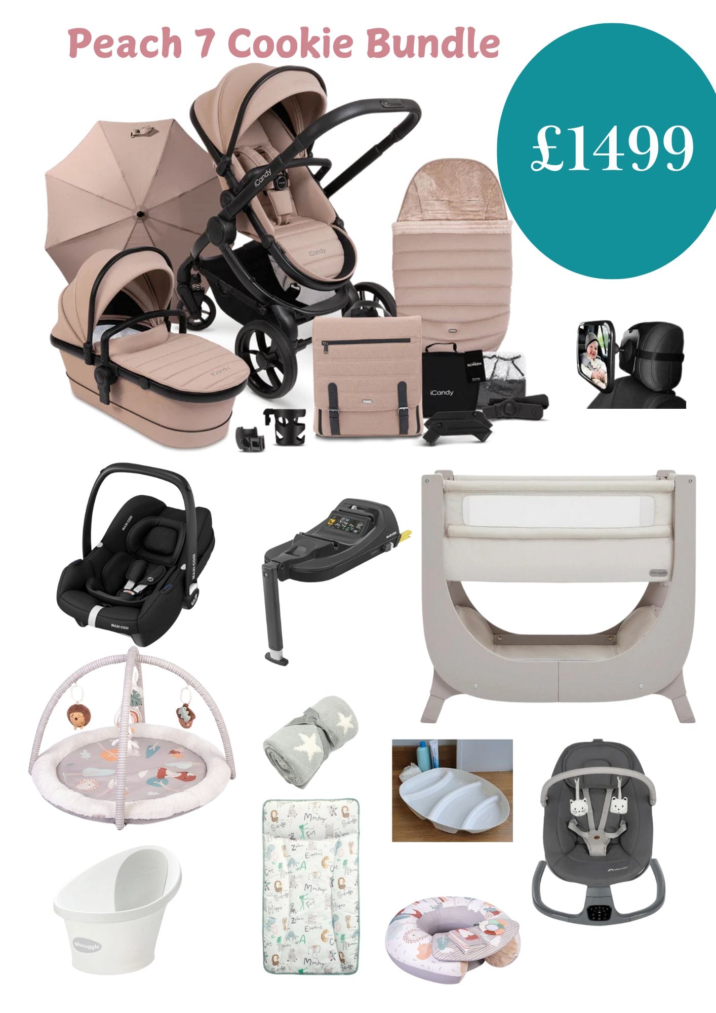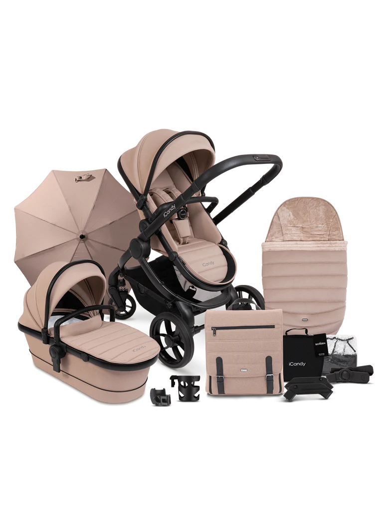 - iCandy Peach7 Cookie including changing bag, winter footmuff, parasol, cup holder and clamp and sunscreen