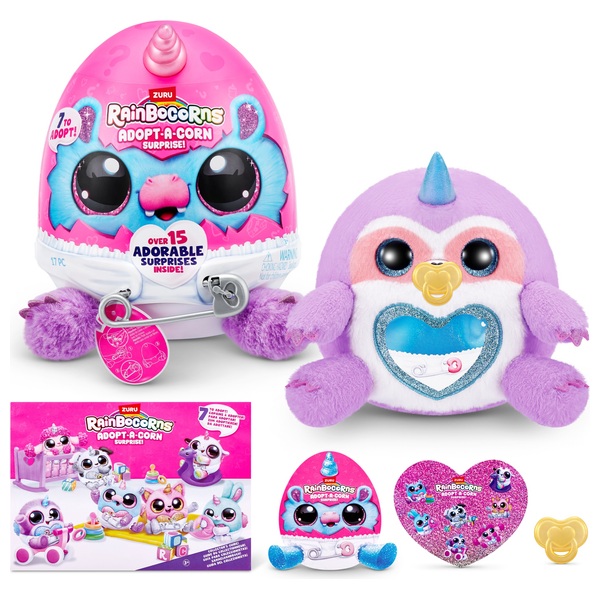 - Contents: 1x Adopt-A-Corn soft toy, 1x pin, 1x diaper storage egg, 1x pacifier, 1x adoption certificate, 10x stickers, 1x peel and reveal Heart and 1x collector’s guide