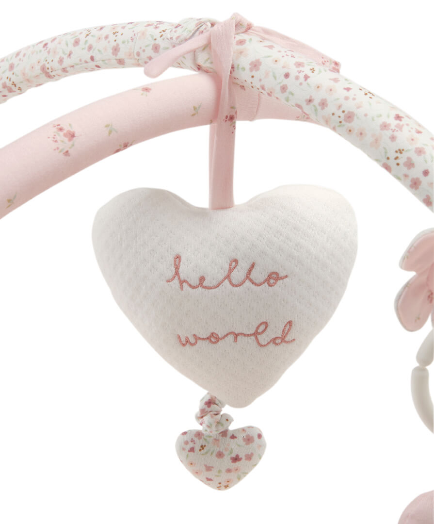 The inclusion of a flower design stitched into the base adds a charming touch, enhancing the aesthetic appeal of the mat. The sweet bunny tummy time toy, hanging toys for sensory development and entertainment, musical hanging heart, and textured teether contribute to the overall functionality and engagement of the mat. These features provide opportunities for babies to explore, develop fine motor skills, and soothe teething discomfort.