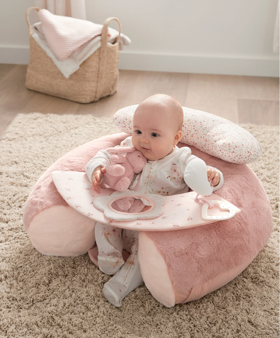 The Sit & Play interactive seat described is a delightful and practical option for engaging babies in independent play while providing them with comfort and support. The inflatable seat with a raised back, adorned with a pretty ditzy floral print, not only adds to the aesthetic appeal but also ensures stability and security for the child.
